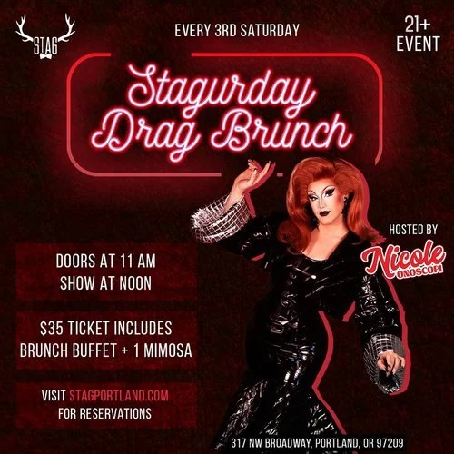 Stag PDX is hosting drag brunches on Saturdays and Sundays from 11 AM-3 PM! Enjoy live performances, an all-you-can-eat buffet, and a complimentary mimosa! Gluten-free and vegan options are available.